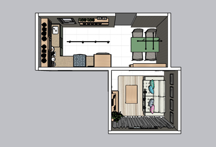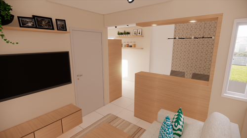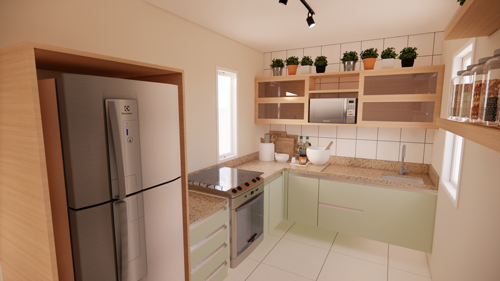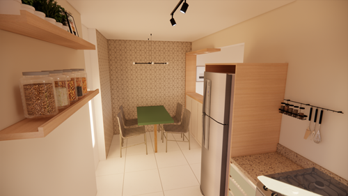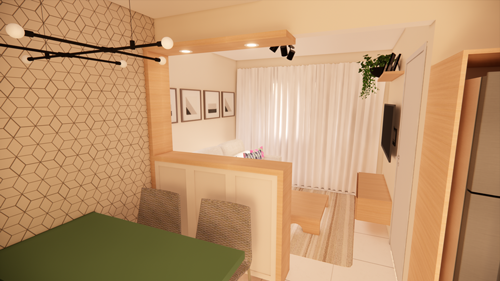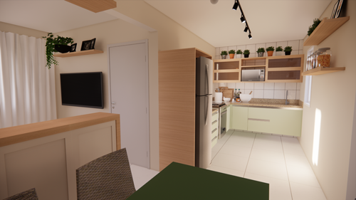 Essa Arqui-Ideia foi criada para transformar a cozinha em um espaço otimizado e visualmente elegante, respeitando a mudança de posição da porta de entrada para o lado da sala. Com uma abordagem integrada, o projeto propôs a criação de um balcão que não apenas divide a cozinha da sala, mas também adiciona um toque moderno e sofisticado ao ambiente.