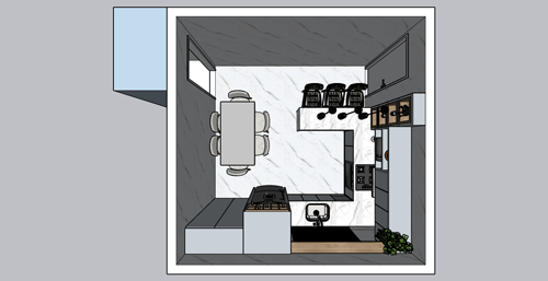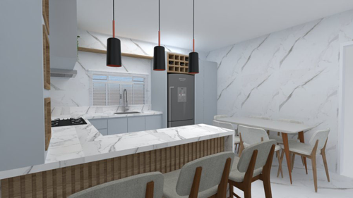 Esta Arqui-Ideia transformou a cozinha em um espaço sofisticado e altamente funcional, adaptando-se perfeitamente às necessidades do cliente. A pia foi reposicionada sob uma janela menor, criando um ponto de destaque no ambiente e aproveitando a luz natural. Para garantir uma melhor integração com o quintal e a futura churrasqueira, a porta lateral foi fechada, otimizando a circulação.