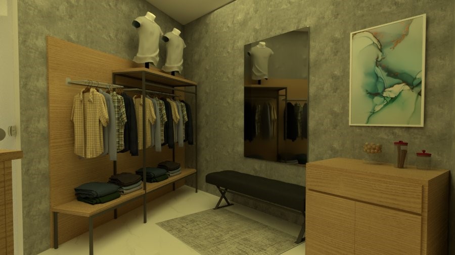 O empreendedor pediu para dividir o salão comercial em 2 ambientes. O primeiro seria o showroom, para receber os clientes: “Quero um ambiente confortável, onde nosso cliente se sinta bem, fica bem aconchegante.” Pediu para usar os móveis que já tinha na loja, colocar mais espelhos e uma TV para apresentação de fotos dos produtos. Outro desejo: “Quero uma cor que está bem em alta, cimento queimado. Quero algo bem moderno industrial.” Fizemos de tudo para que esse espaço tivesse a cara do cliente. Ficou lindo.