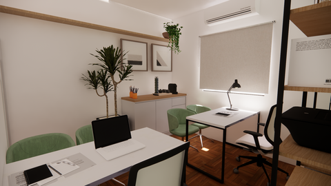 Este cliente pediu algo discreto e elegante, para trabalhar o dia todo com tranquilidade. Por isso, a opção por tons pasteis e vasos com plantas. Quem não se sente melhor trabalhando assim? Nossas ideias seguem sempre o desejo dos clientes, e neste caso, pensamos para que ele trabalhasse por horas, em harmonia com o ambiente, sem ver o tempo passar.