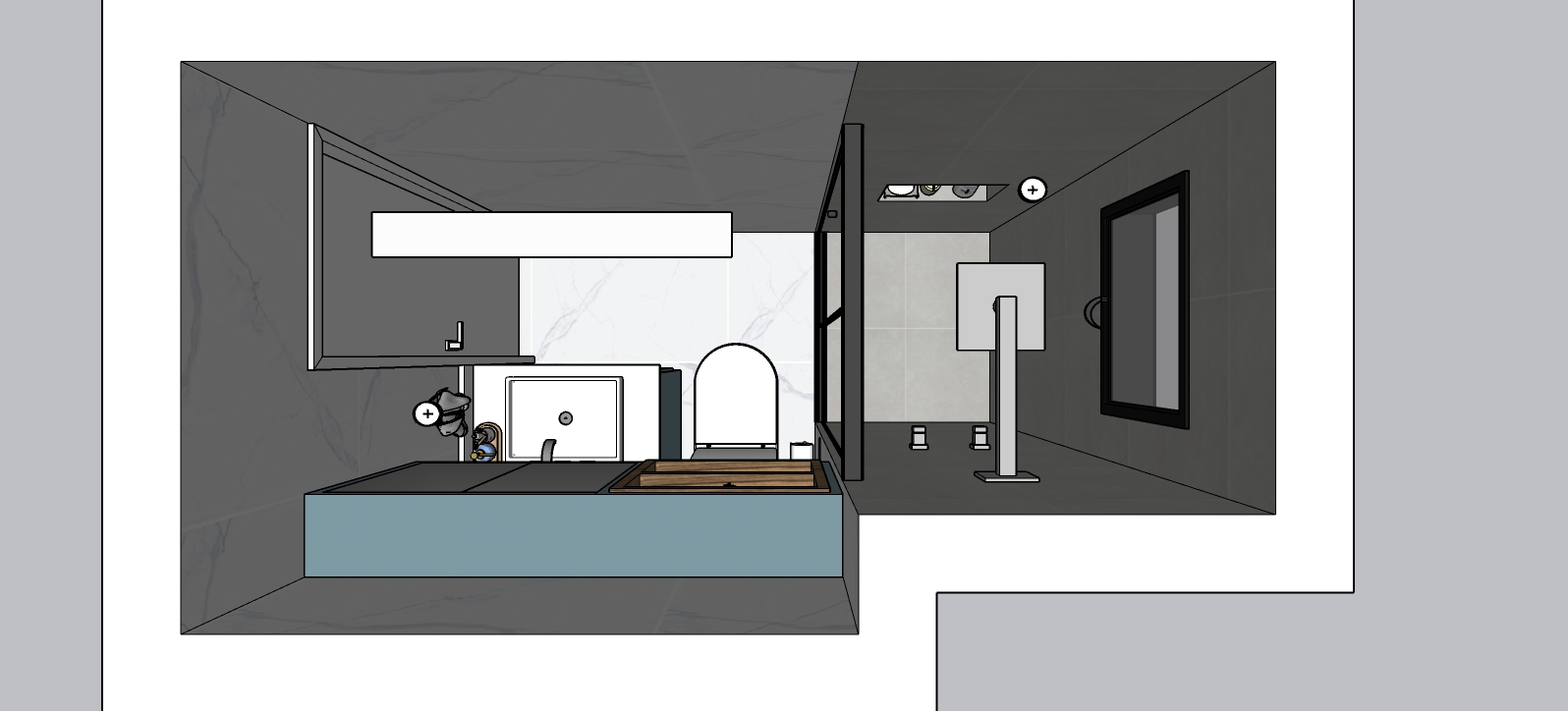 Azul, branco e madeira, iluminação decorativa. Assim o cliente descreveu o pequeno banheiro de seu novo apartamento, para se sentir bem e confortável. Explorando os pedidos do cliente, adicionamos iluminação variada com fita led, spots e placa embutida, além de box com serralheria preta, como da janela existente.